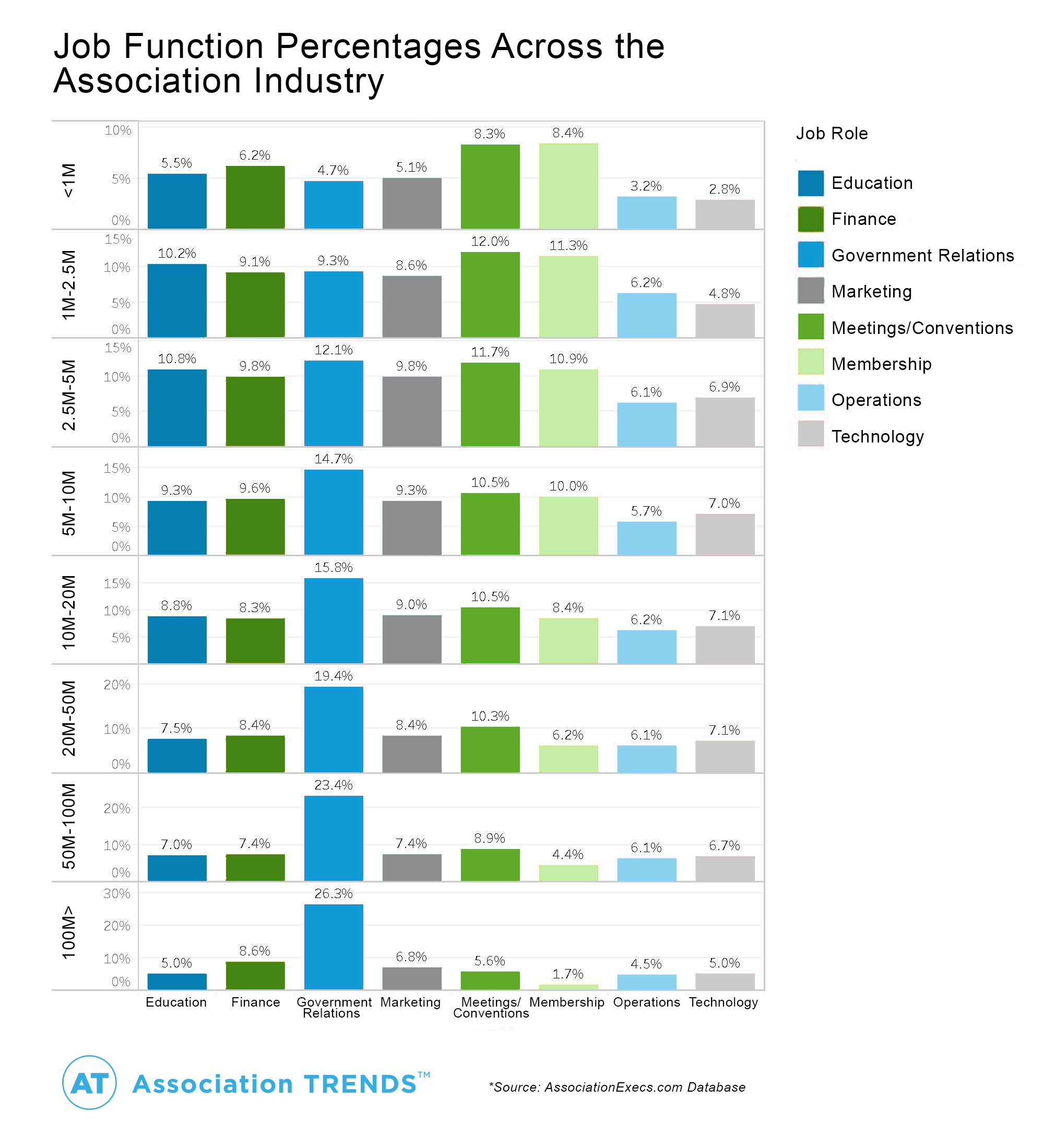 AssociationExecs.com houses over 150,000 association staff profiles segmented into job functions including finance, information technology, marketing, membership, and more. With such a wide range of associations types, industries, sizes, and revenues, Association TRENDS wondered how those job functions changed from association to association.