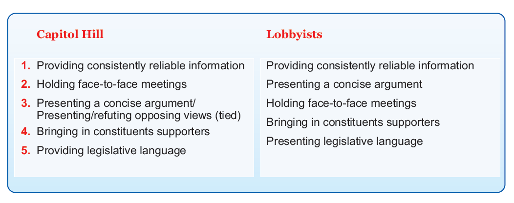 Given the age gap between lobbyists and the people they are trying to influence, it is essential to know what is important to Hill staffers. According to the chart below*, both lobbyists and Hill staff agree that providing the most credible and reliable information is the most important factor in influencing Congressional staff.