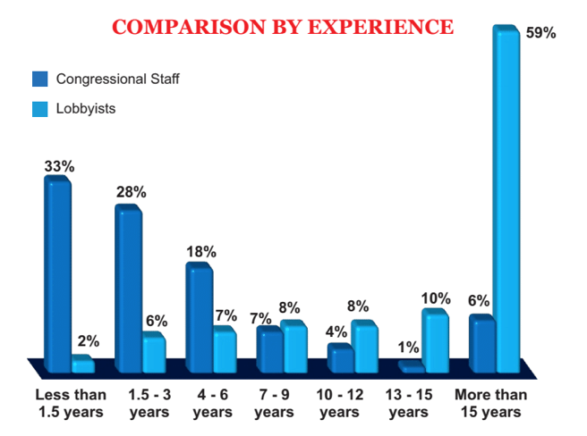 For example, turnover rate on the Hill is higher than ever, so it’s difficult to keep track of current Congressional staff. The graph below demonstrates how many years of experience lobbyists have in comparison with the Hill staffers with whom they are attempting to communicate. In 2012, 24% of Hill staffers stayed on the Hill for less than 18 months. In 2017 that number jumped to 33%. Additionally, in 2012, 46% of Hill staffers worked on the Hill for less than 3 years and in 2017, 61% worked for less than 3 years.