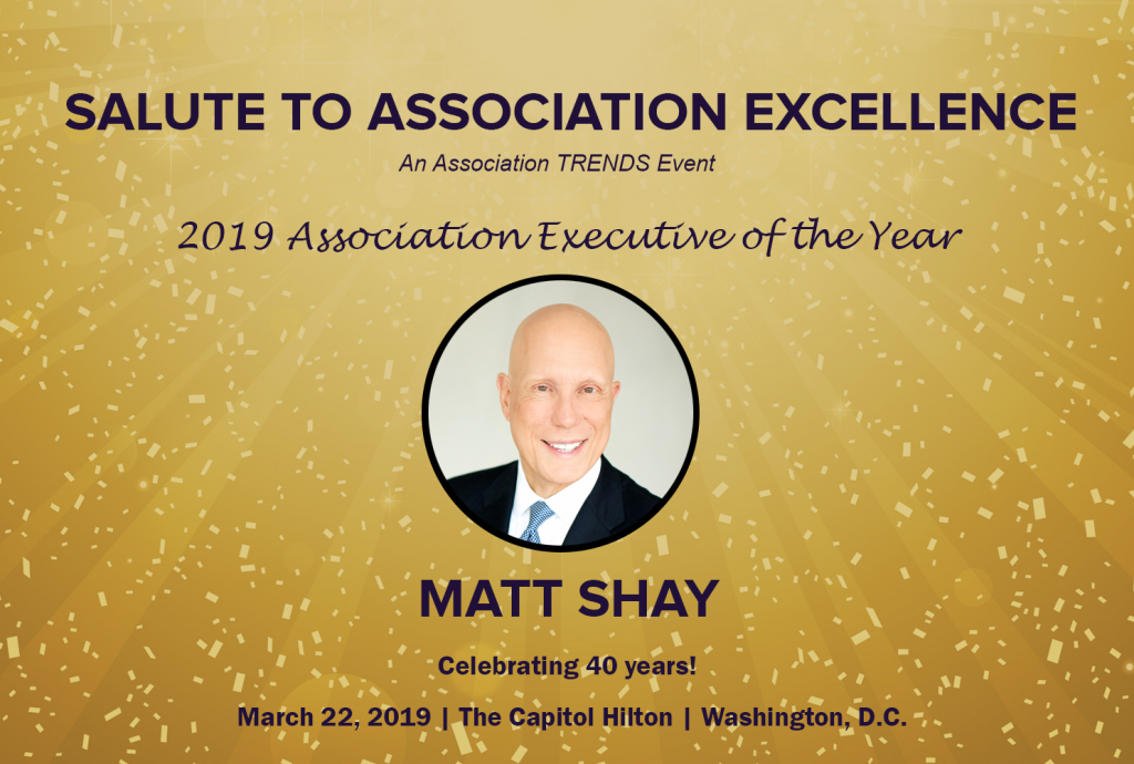 “Matt’s commitment to the association industry, his staff, and members is well known as evidenced by the numerous nominations and endorsements he received during the selection process. As we celebrate the 40th anniversary of the Salute to Association Excellence, we could not think of a more deserving recipient of its highest honor,” stated Brittany Carter, President, Association TRENDS.
