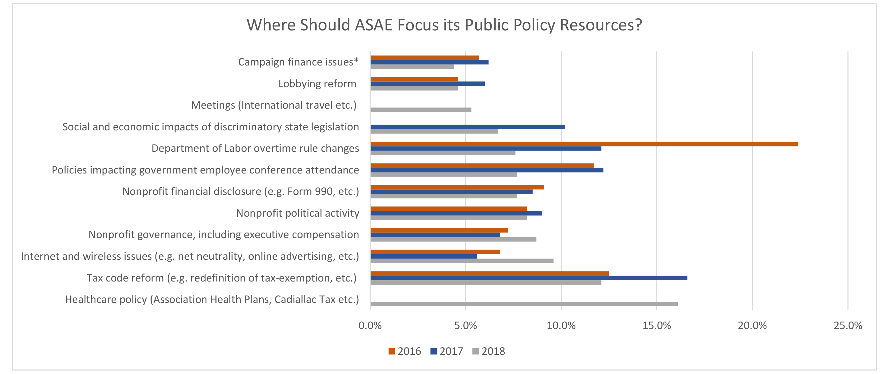 In March, Association TRENDS’ Advocacy Team, the provider of ASAE’s custom Congressional Handbooks, attended ASAE American Associations Day to learn more about policy priorities in the association community. As part of the fly-in, each year ASAE produces an advocacy priority study where they ask their CEO and government relations executive members where ASAE should be focusing their public policy resources and what issues are important to the association community. ASAE gave survey takers a list of public policy issues and asked that they assign a percentage of time they felt ASAE should spend on each one. We created the chart below to highlight the shifts in priorities over time. As you will see in the chart, the policy priorities closely track with active legislation including the DOL labor laws in 2016 and the surge in tax reform interest in 2017. Other areas that remain a steady focus overtime were nonprofit governance and political activity. Of note for 2018 was the growth in internet and wireless issues interest.