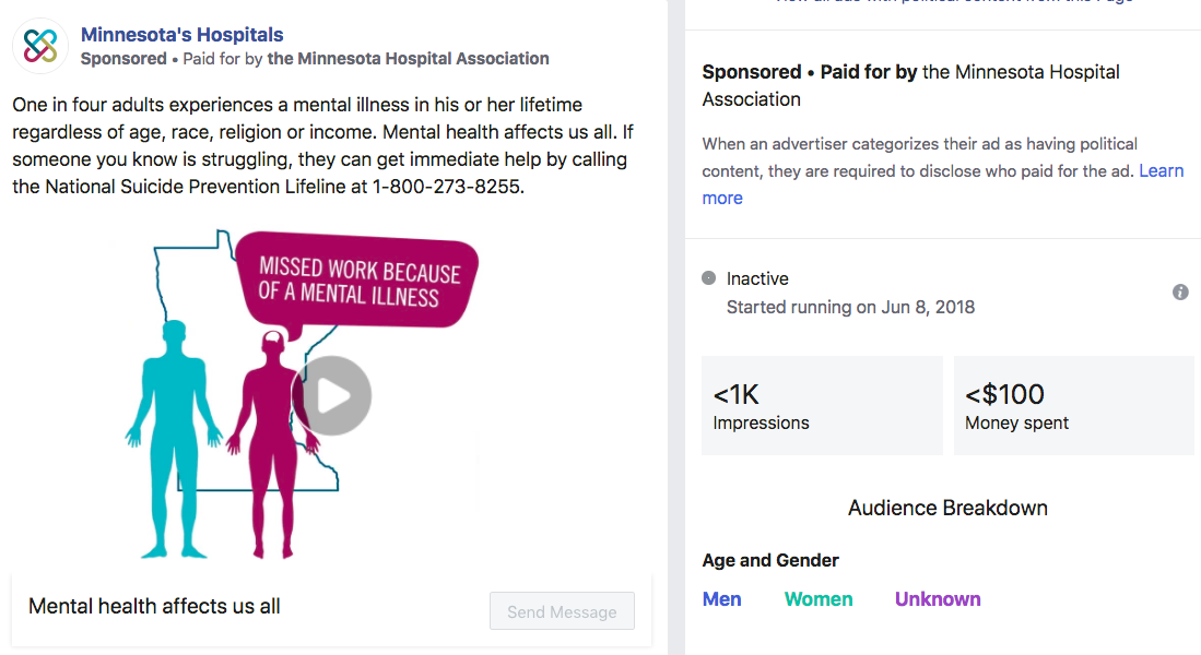 So for the Minnesota Hospital Association post above, that’s just giving the number for the National Suicide Prevention Lifeline, indicates, as presumably, any association post touching on any of the issues listed above, that the association checked a box indicating that the ad has political content. What happens when 501(c)(3)s that pay to promote every post, because that’s pretty much the only way you get any reach on Facebook these days, start being flagged by the IRS for exceeding the expenditure test and lose their nonprofit status? After all, the Catch 22 is now in effect that basically mandates that issue-focused organizations check a box indicating that every paid post is a political ad or risk your ad, and all future ads that don’t include the political checkbox checked, being rejected. Should they not run any FB ads because this applies not only to content in the promoted post/ad, but also on the landing page.